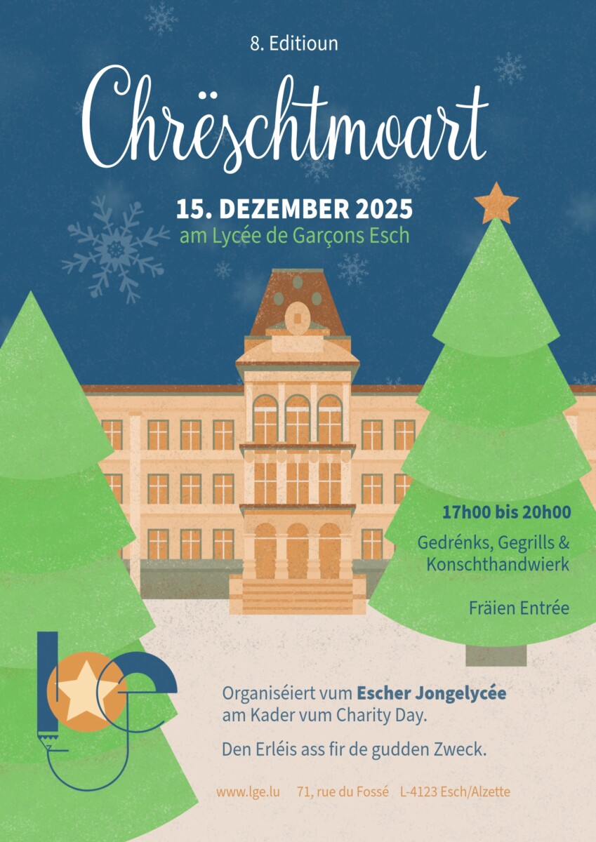 E risege Merci geet un all d’Schülerinnen a Schüler, hir Enseignanten, de Schülercomité, d’APELGE, d‘AVEK esouwéi un dat administratiivt an technescht Personal. An natierlech och un all d’Visiteuren, d‘Elteren, d‘Familljen, d‘Frënn an d‘Nopere vum LGE, déi mat hirer Präsenz a Generositéit dëse Chrëschtmoart zum Liewe bruecht hunn.