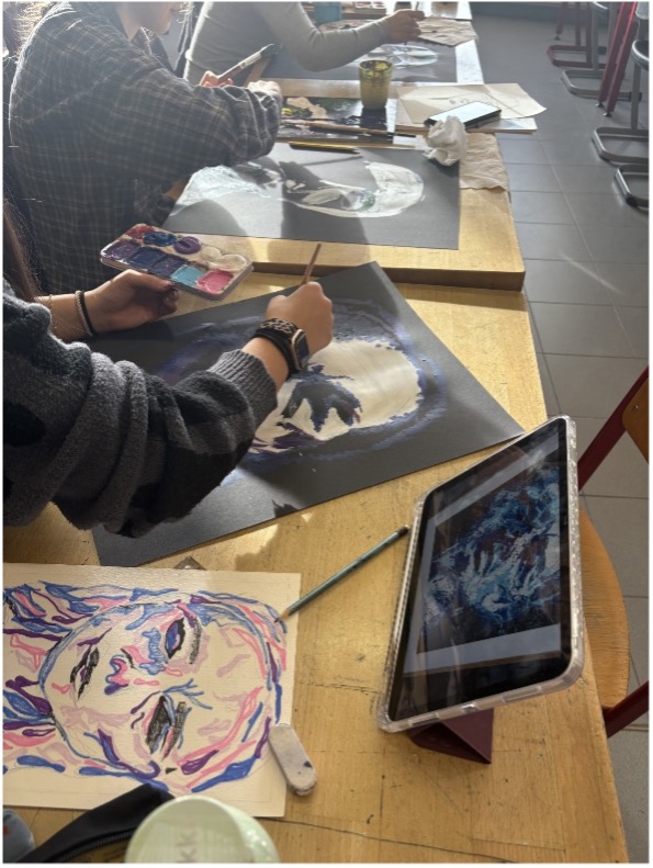 Lors de la seconde phase, les élèves ont procédé à la réalisation picturale à partir d’un support visuel inspiré de l’artiste. Bien que le point de départ commun soit clairement identifiable, les travaux produits témoignent d’une appropriation personnelle du sujet. Les résultats sont restés individuels et singuliers, démontrant la capacité des élèves à interpréter une référence artistique sans se limiter à une simple reproduction.