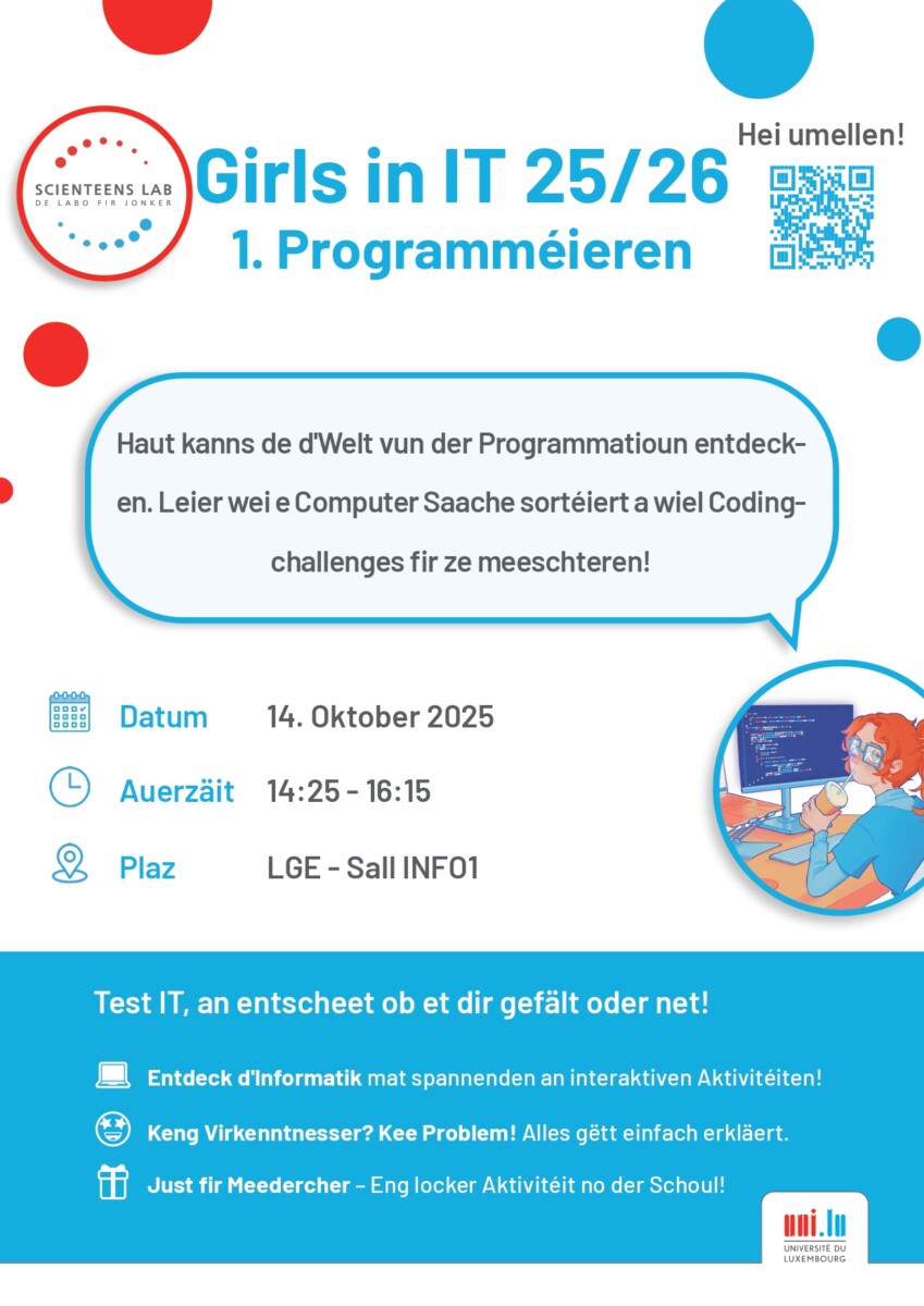 den Dënschden, de 14. Oktober fënnt vun 14.25 bis 16.15 Auer den Atelier “Girls in IT” vum ScienteensLab am LGE statt. De Projet vum ScienteensLab verfollegt d’Zil Meedercher ze motivéieren, sech fir Informatik ze interesséieren – e Fach, an deem haut haaptsächlech Männer aktiv sinn.