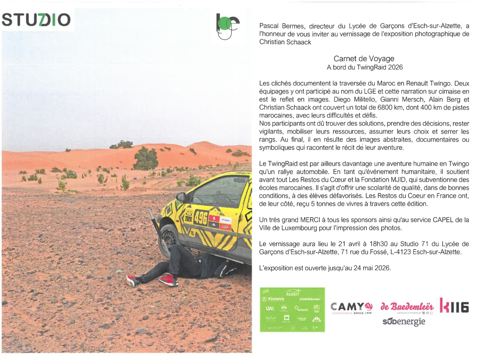 Vernissage de l’exposition « Carnet de Voyage – A bord du TwingRaid 2026 » 21/04/2026 18:30 informations sur l’aventure du Twing Raid : https://lge.lu/category/twingraid/ https://www.tageblatt.lu/Luxemburg/LGE-Twingo-Tour-von-Esch-nach-Marokko-in-Bildern-63608.html